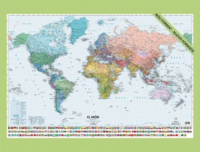 Nou format del mapa d’El Món amb la informació de 196 països: capitals, ciutats importants…així com els principals accidents físics: oceans, mars, rius, serralades, deserts…Amb les banderes oficials dels països.